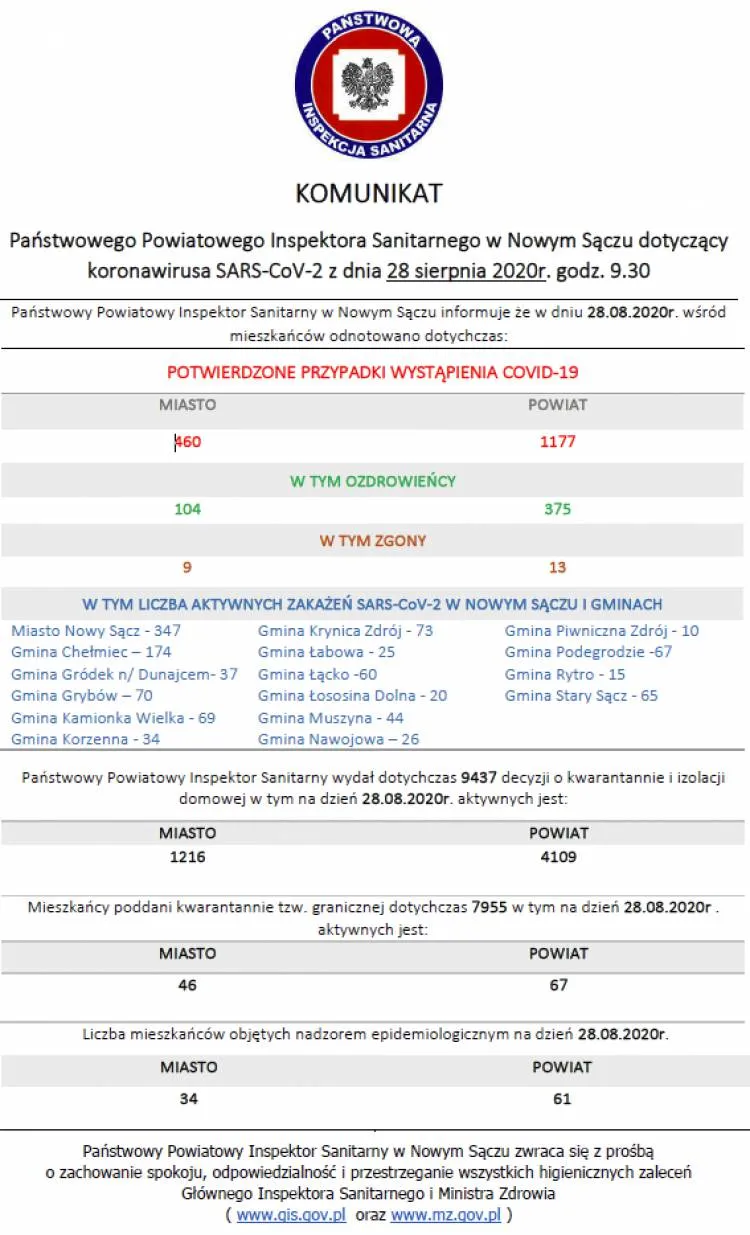 Dzisiaj na terenie powiatu nowosądeckiego odnotowano 9 kolejnych zakażeń wirusem SARS-CoV-2, a w mieście Nowy Sącz 9. Niestety są też kolejne ofiary śmiertelne wirusa wśród których jest dwóch mieszkańców Nowego Sącza: 85-letni oraz 72-letni, którzy przebywali w Szpitalu Uniwersyteckim w Krakowie. Z kolei w regionie, w powiecie limanowskim jest 16 nowych zachorowań, a w powiecie gorlickim 3. Pojawiło się także 26 ozdrowieńców.
