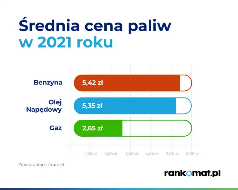 Ze wszystkich wydatków związanych z utrzymaniem samochodu najmocniej kierowcy odczuli te przeznaczone na paliwo. Najtańszy w 2021 roku jak zawsze był gaz LPG 2,65 zł/l. Najdroższa okazała się benzyna – 5,42 zł/l. Nieco taniej dało się zatankować litr oleju napędowego, a dokładnie za 5,35 zł. Wszystkie wartości są średnimi rocznymi cenami.