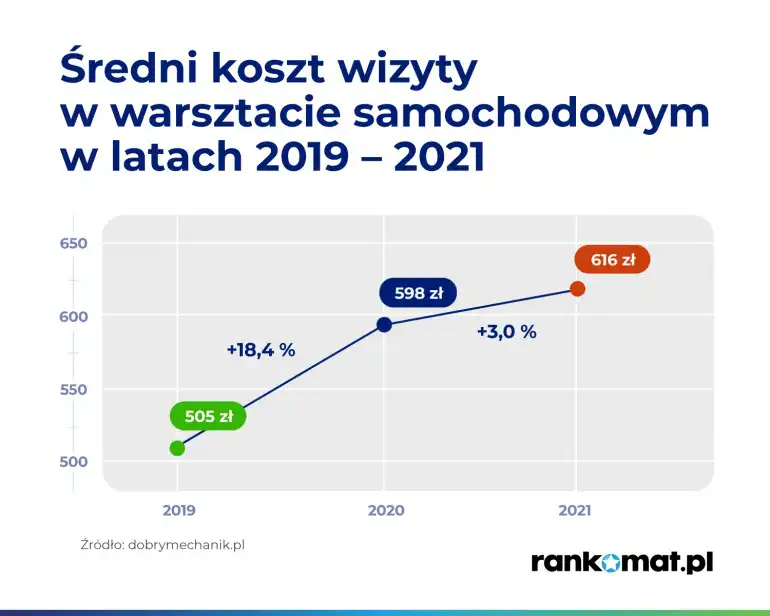 W 2019 roku za naprawę samochodu polscy kierowcy płacili średnio 505 złotych – wynika z danych serwisu dobrymechanik.pl. Kolejnego roku ten koszt był już wyższy o 18,4%. W ubiegłym roku podwyżka wyhamowała i wyniosła jedynie 3% względem roku 2020. Tym samym średni koszt wizyty w warsztacie wyniósł 616 zł.