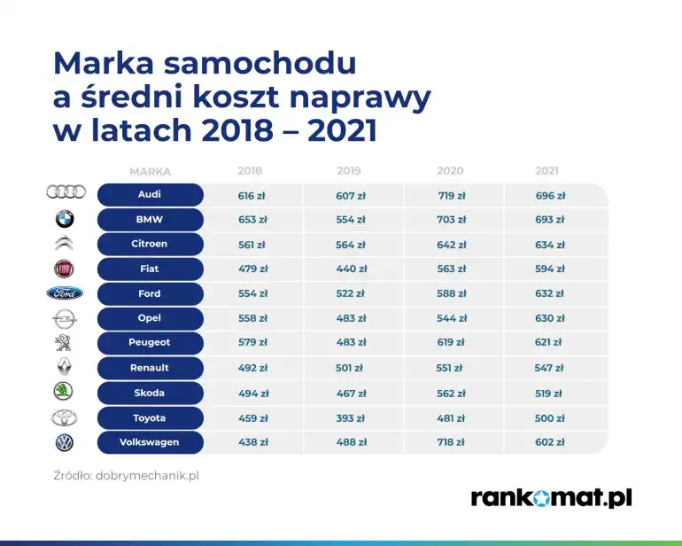 W porównaniu do 2020 roku największe wzrosty średniej wartości naprawy samochodu w ramach jednej wizyty umówionej przez dobrymechanik.pl dotyczyły marki Opel i wyniosły 16%. Dla pozostałych badanych marek podwyżki osiągnęły poziom od 0,3% (Peugeot) do 7,5% (Ford). Jednak wśród 11 najpopularniejszych na polskich drogach marek znalazło się 6, których koszt serwisowania zmalał. Spadki wyniosły od 0,4% (Renault) do 16,2% (Volkswagen).