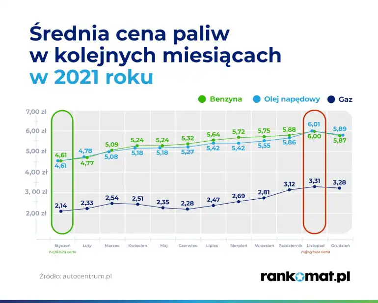 W 2021 roku średnie ceny benzyny i oleju napędowego regularnie rosły od stycznia do listopada. W tym czasie podrożały o 1,40 zł, aby w grudniu spaść o 13 gr. W tym samym okresie, gaz LPG miał swoje zwyżki oraz obniżki i choć od stycznia do listopada podrożał tylko o 1,17 zł, to był to wzrost o ponad 50%, podczas gdy benzyna i olej napędowy podrożały tylko o 30%.
