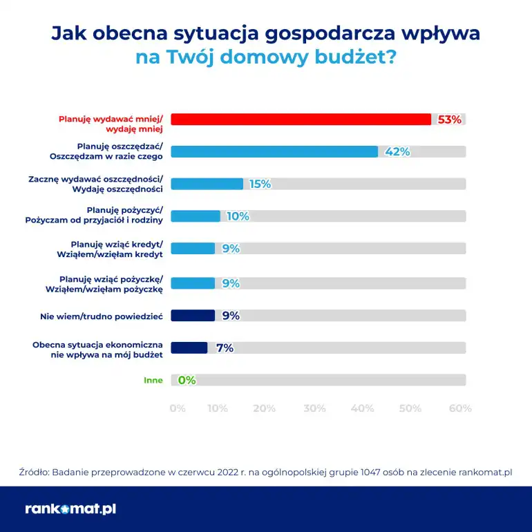 Bieżąca sytuacja gospodarcza wymusza zmiany w dotychczasowych zachowaniach konsumentów, którzy chcą jak najlepiej przygotować się na potencjalne trudności w zarządzaniu domowym budżetem. Według danych z badania przeprowadzonego w czerwcu 2022 r. na zlecenie rankomat.pl ponad połowa Polaków (53%) zadeklarowała, że wydaje mniej pieniędzy lub planuje ograniczyć wydatki. Natomiast 42% ankietowanych poszło krok dalej i zamierza oszczędzać lub już to robi.