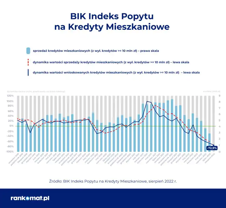 Sierpniowy odczyt BIK Indeksu Popytu na Kredyty Mieszkaniowe (BIK Indeks – PKM) odsłania kolejny etap gwałtownej zapaści w tym segmencie. W sierpniu 2022 r., w przeliczeniu na dzień roboczy, banki i SKOK-i przekazały do BIK zapytania o kredyty mieszkaniowe na kwotę niższą o 72,9% w porównaniu do analogicznego miesiąca poprzedniego roku. W ujęciu ilościowym w sierpniu br. o kredyt mieszkaniowy wnioskowało 12,39 tys. osób, w porównaniu do 42,54 tys. rok wcześniej.