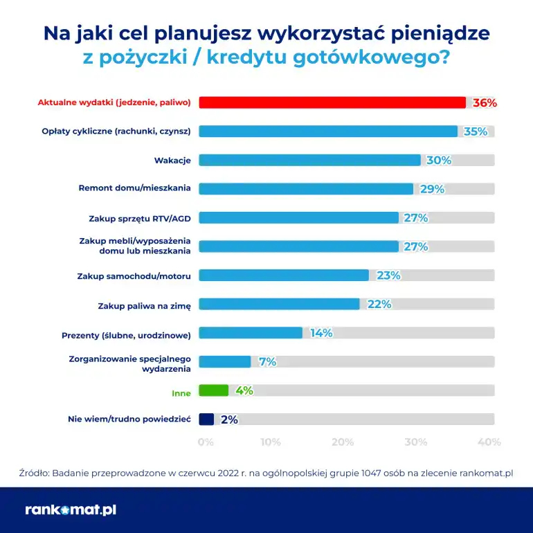 Niepewna sytuacja gospodarcza, wzrost kosztów spłacanych kredytów oraz dwucyfrowa inflacja sprawiły, że Polacy coraz częściej zadłużają się, aby zaspokoić swoje podstawowe potrzeby. Zgodnie z badanem przeprowadzonym w czerwcu 2022 r. na zlecenie rankomat.pl aż 36% osób, które zaciągnęły lub planują zaciągnąć pożyczkę albo kredyt gotówkowy, zadeklarowało, że pozyskane w ten sposób pieniądze przeznaczy na bieżące wydatki, jak zakup żywności czy paliwa.