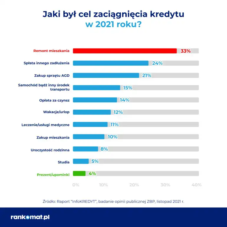 Aby uchwycić zmianę pobudek osób zaciągających kredyty, spowodowaną w główniej mierze dynamicznym wzrostem kosztów życia, spadkiem wartości nabywczej pieniądza i niepewnością jutra, warto sięgnąć do Raportu InfoKredyt przygotowanego przez Związek Banków Polskich. Z przeprowadzonego przez ZBP badania opinii publicznej wynika, że najważniejszym celem zaciągnięcia kredytu w 2021 r. był remont mieszkania – 33% wskazań.