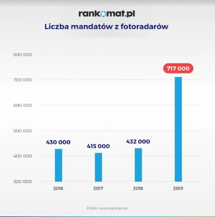 W 2019 r. w wyniku działania fotoradarów nałożono 717 000 mandatów. To aż o 66% więcej niż