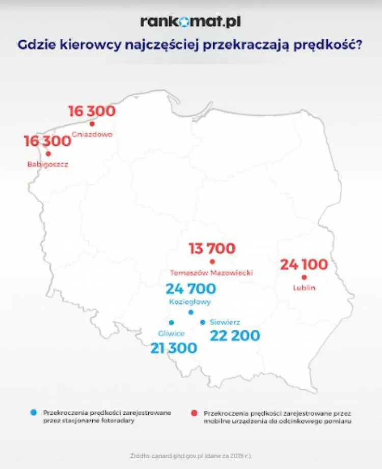 W 2019 r. stacjonarne fotoradary największą liczbę kierowców przekraczających dopuszczalną prędkość zarejestrowały w trzech miejscowościach województwa śląskiego. W Koziegłowach (24 700 przypadków), a także w Siewierzu (22 200) oraz Gliwicach (21 300). Natomiast mobilne urządzenia do odcinkowego pomiaru prędkości, najczęściej na zbyt szybkiej jeździe przyłapały kierujących w Lublinie (24 100).
