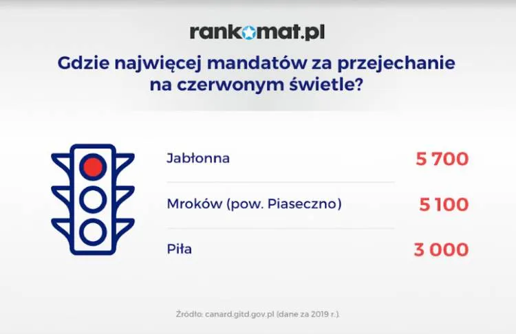 W Polsce dla poprawy bezpieczeństwa na drogach używa się nie tylko fotoradarów, lecz także rejestratorów przejazdu na czerwonym świetle. W 2019 r. pomimo sygnalizacji braku prawa przejazdu, kierowcy najczęściej nie zatrzymywali się w Jabłonnej (5700 zarejestrowanych przypadków), a także w Mrokowie (5100). Obie miejscowości są zlokalizowane w województwie mazowieckim.
