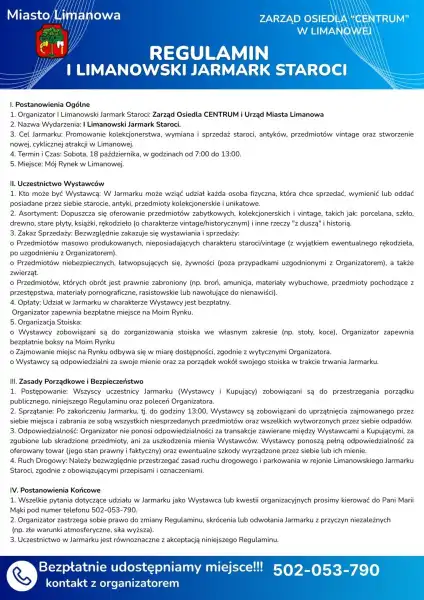 Miasto Limanowa zaprasza mieszkańców i gości na wyjątkowe wydarzenie – I Limanowski Jarmark Staroci, który odbędzie się w sobotę, 18 października na „Moim Rynku”. To pierwsza edycja imprezy, która ma szansę wpisać się na stałe w kalendarz lokalnych atrakcji i przyciągać zarówno kolekcjonerów, jak i osoby, które po prostu cenią sobie piękno przedmiotów z duszą.