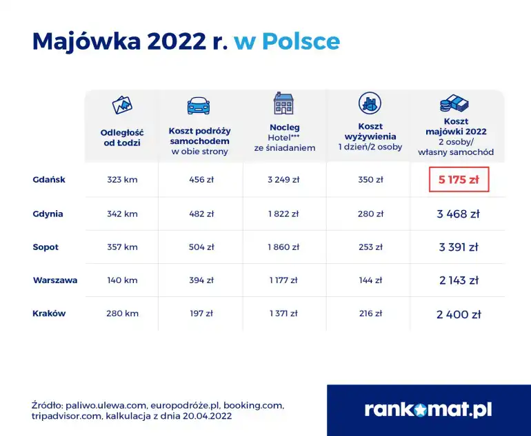 Najwyższy koszty noclegu, wyżywienia i podróży dla dwóch osób - w odniesieniu do centralnego miasta na mapie kraju (Łódź) - sięga 5 175 zł w Gdańsku. Koszt końcowy majówki jednak spada, kiedy zamiast zatrzymywać się w 3* hotelu, postawimy na pensjonat – niekoniecznie w centrum miasta. Pokój dwuosobowy typu standard, w pensjonacie oddalonym o 9 km od centrum Gdańska, kosztuje 1 217 zł. Dzięki takiej cenie koszt końcowy majówki w Gdańsku sięga kwoty 3 143 zł, czyli o 2 032 zł mniej.