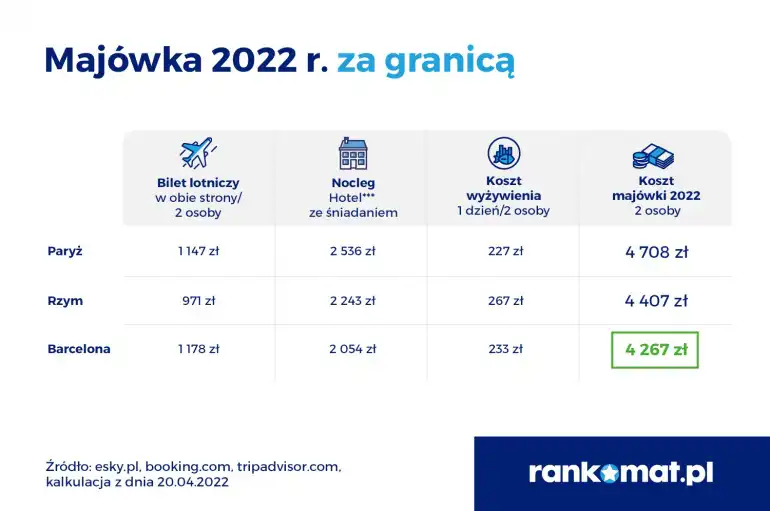 Najdroższe rozwiązanie – czyli majówkowy city break w Paryżu jest wciąż tańsze od długiego weekendu w Polsce. 467 zł zaoszczędzimy, zamieniając Gdańsk na Paryż. Najbardziej opłaca się spędzić majówkę w Barcelonie, wydając o 2 124 zł więcej niż w Warszawie.
