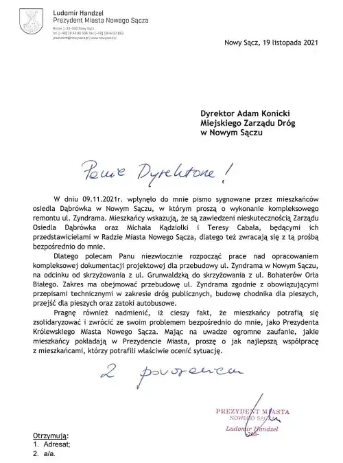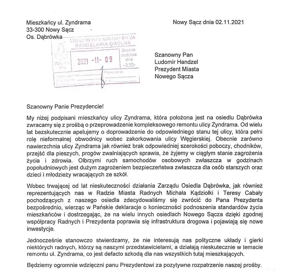 9 listopada br. mieszkańcy Osiedla Dąbrówka zwrócili się w piśmie do prezydenta Ludomira Handzla o długo wyczekiwany kompleksowy remont ulicy Zyndrama.