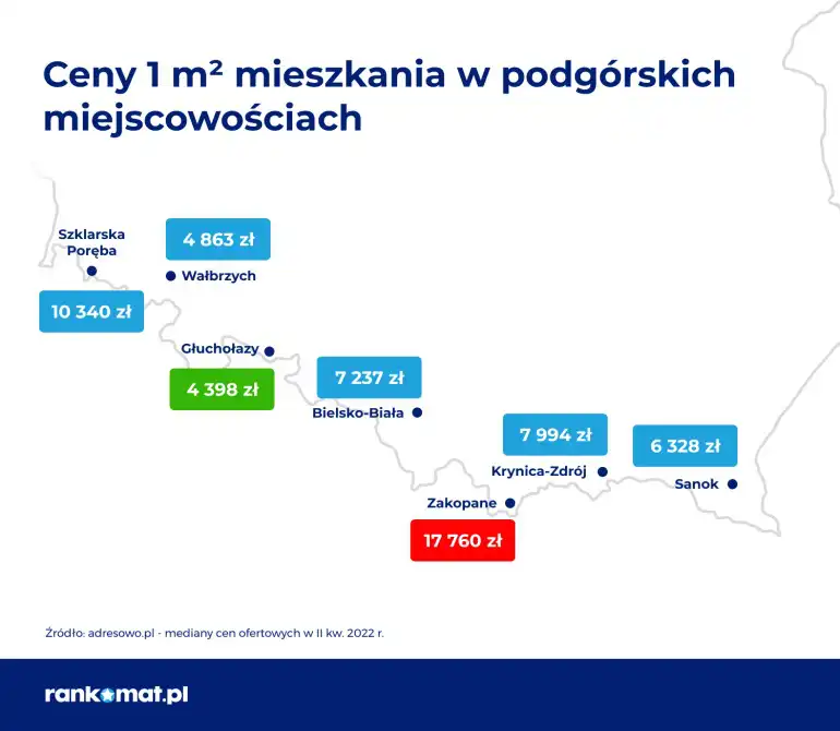 Najtańsze w zestawieniu są miejscowości w Sudetach ze stawką poniżej 5000 zł/m2. W Wałbrzychu leżącym w Górach Wałbrzyskich za 1m2 mieszkania z rynku wtórnego trzeba zapłacić 4863 zł. Jeszcze mniej w Głuchołazach na pograniczu Gór Opawskich - 4398 zł.