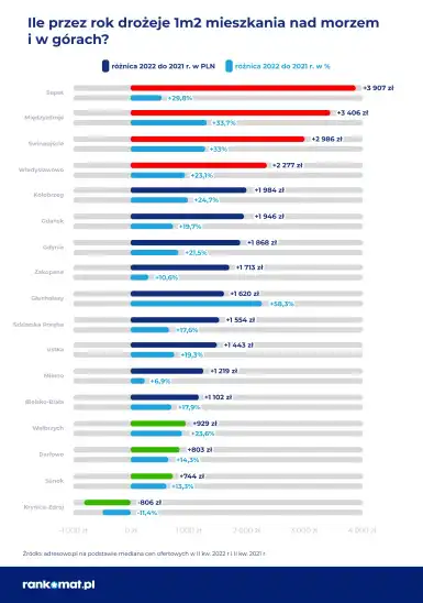 Eksperci z porównywarki rankomat.pl przeanalizowali aktualne ceny mieszkań z rynku wtórnego w 17 miejscowościach położonych nad morzem i w górach. Podane stawki są medianami cen ofertowych dostępnych na portalu adresowo.pl i dotyczą II kwartału 2022 r. Dla porównania zostały zestawione ze stawkami sprzed roku, czyli z II kwartału 2021 r.