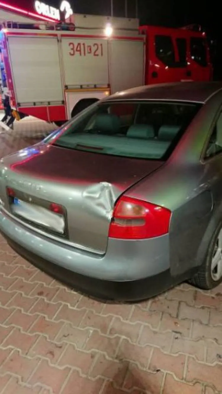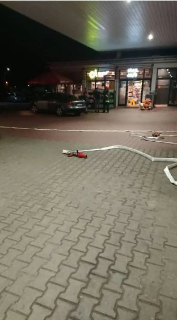 W wyniku zdarzenia doszło do wyrwania węża z dystrybutora, uderzenia nim w filar zadaszenia stacji, a następnie w samochód.