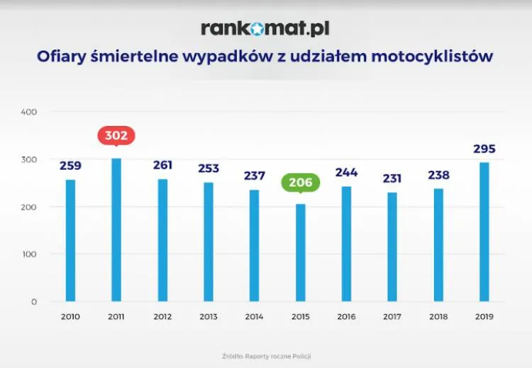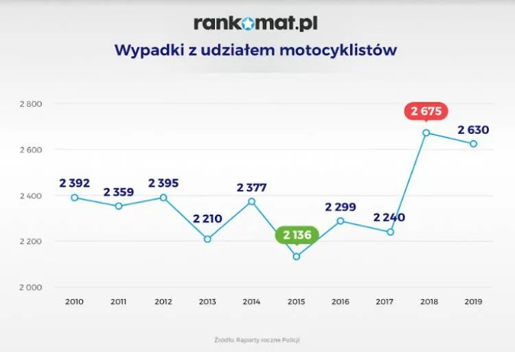W 2019 r. do 2630 wypadków z udziałem motocyklistów i zostało w nich rannych 2161 motocyklistów oraz 221 ich pasażerów. To o 91 mniej rannych niż w 2018 r. (–3,6%), a jednocześnie aż o 485 więcej niż w 2015 r (+25,5%). Liczba wypadków zmniejszyła się w stosunku do 2018 r., jednak zeszłoroczny wynik był drugim największym do tej pory.