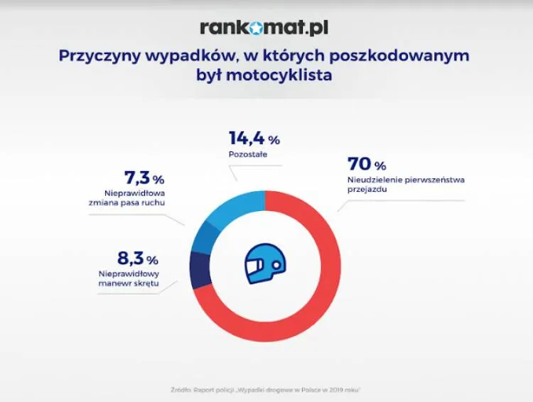 Główną przyczyną wypadków, w których poszkodowani zostali motocykliści z winy innych użytkowników dróg, było nieudzielenie pierwszeństwa przejazdu (70%). Znacznie rzadziej nieprawidłowy manewr skrętu (8,3%), a także nieprawidłowa zmiana pasa ruchu (7,3%).
