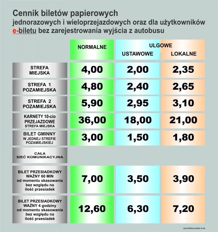 BILETY PAPIEROWE JEDNORAZOWE I WIELOPRZEJAZDOWE ZACHOWUJĄ SWOJĄ WAŻNOŚĆ I MOGĄ ZOSTAĆ WYKORZYSTANE DO TRZECH MIESIĘCY LICZĄC OD DATY WEJŚCIA W ŻYCIE NOWEGO CENNIKA USŁUG KOMUNIKACYJNYCH, POD WARUNKIEM UZUPEŁNIENIA ICH DO WŁAŚCIWEGO NOMINAŁU BILETEM UZUPEŁNIAJĄCYM.
