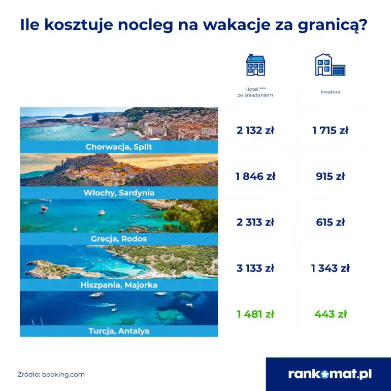 Na tle tych cen koszt wakacji za granicą jawi się jako znacznie tańsza alternatywa urlopu nad Bałtykiem, w górach czy na Mazurach. W polskich kurortach analizowanych przez ekspertów rankomat.pl nie da się znaleźć w szczycie sezonu noclegu w hotelu trzygwiazdkowym poniżej 2 000 zł.