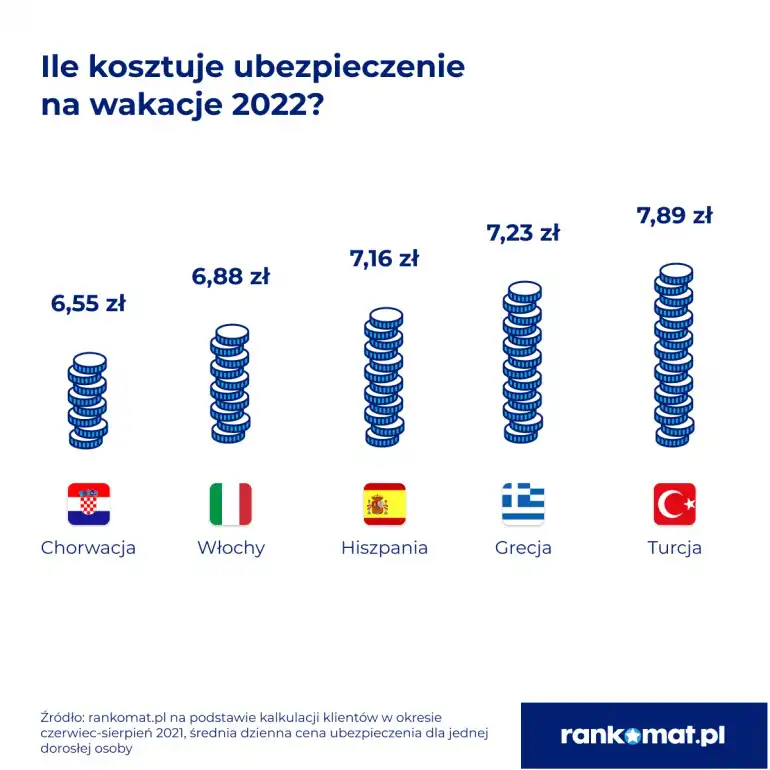 W dobie galopującej inflacji i ciągłego zaciskania pasa jedynie ceny ubezpieczeń pozostają bez zmian. Informacja ta napawa optymizmem, tym bardziej że ochronę do poszczególnych państw można mieć już za kilka złotych dziennie. Najmniej za polisę płacili podróżujący do Chorwacji - średnia cena ubezpieczenia turystycznego, dla jednej dorosłej osoby, wybieranego przez klientów rankomat.pl wynosi 6,55 zł za osobę. Poniżej 7 zł kosztowała polisa do Włoch. Najwięcej płacili wyjeżdżający do Turcji – średnio 7,89 zł za dzień. Nieco niej na ubezpieczenie wydali odpoczywający w Grecji (7,23 zł dziennie) i w Hiszpanii (7,16 zł/dzień).