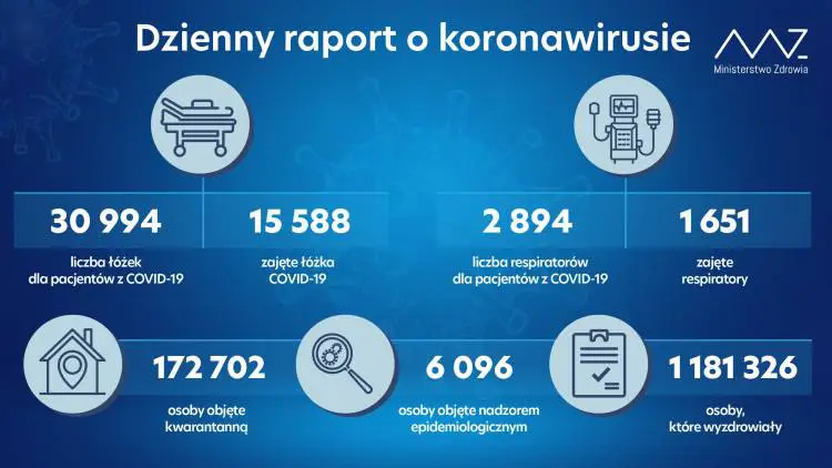 Od początku pandemii w Polsce odnotowano 1 435 582 zakażeń koronawirusem. Zmarło 33 355 osób. Wyzdrowiało 1 181 326.
