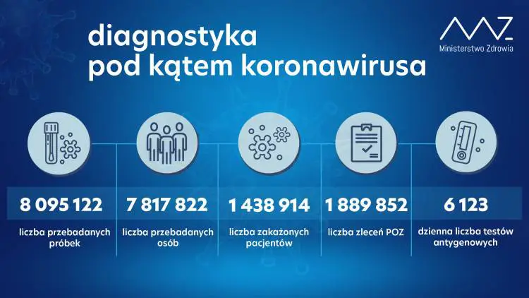 Od początku pandemii w Polsce odnotowano 1 438 914 zakażeń koronawirusem. Zmarło 33 407 osób. Wyzdrowiało 1 187 719.