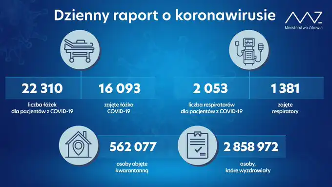 Od początku pandemii w Polsce odnotowano 3 303 046 zakażeń koronawirusem. Zmarło 80 399 osób. Wyzdrowiało 2 858 972.