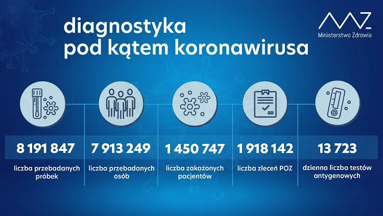 Od początku pandemii w Polsce odnotowano 1 450 747 zakażeń koronawirusem. Zmarło 34 141 osób. Wyzdrowiało 1 197 931.