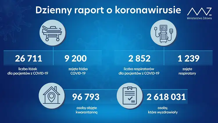 Od początku pandemii w Polsce odnotowano 2 863 031 zakażeń koronawirusem. Zmarło 72 691 osób. Wyzdrowiało 2 618 031.