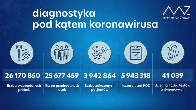 Od początku pandemii w Polsce odnotowano 3 942 864 zakażeń koronawirusem. Zmarło 91 415 osób. Wyzdrowiało 3 412 313.