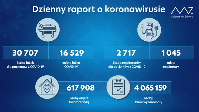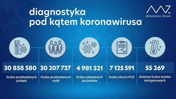 Od początku pandemii w Polsce odnotowano 4 981 321 zakażeń koronawirusem. Zmarło 105 753 osób. Wyzdrowiało 4 065 159.