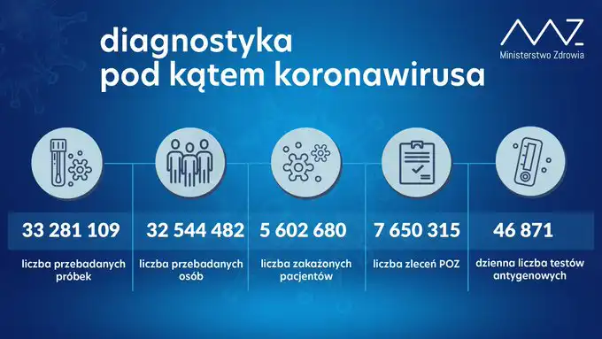 Od początku pandemii w Polsce odnotowano 5 602 680 zakażeń koronawirusem. Zmarło 110 517 osób. Wyzdrowiało 4 969 881.