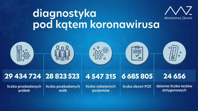 Od początku pandemii w Polsce odnotowano 4 547 315 zakażeń koronawirusem. Zmarło 103 846 osób. Wyzdrowiało 3 861 908.