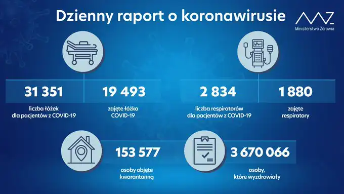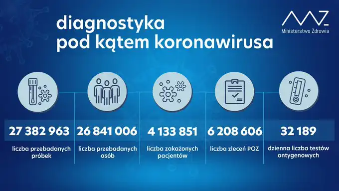 Od początku pandemii w Polsce odnotowano 4 133 851 zakażeń koronawirusem. Zmarło 97 601 osób. Wyzdrowiało 3 670 066.
