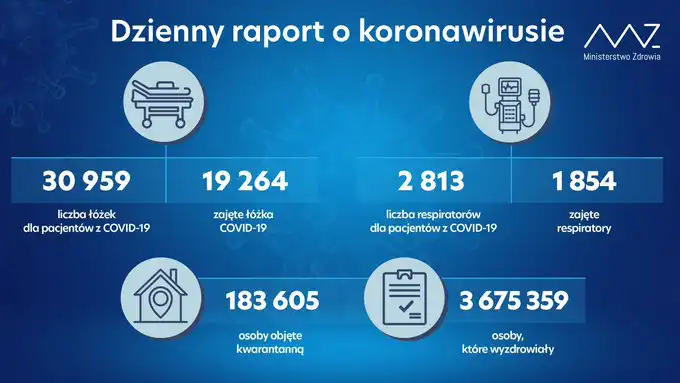 Od początku pandemii w Polsce odnotowano 4 162 715 zakażeń koronawirusem. Zmarło 98 666 osób. Wyzdrowiało 3 675 359.