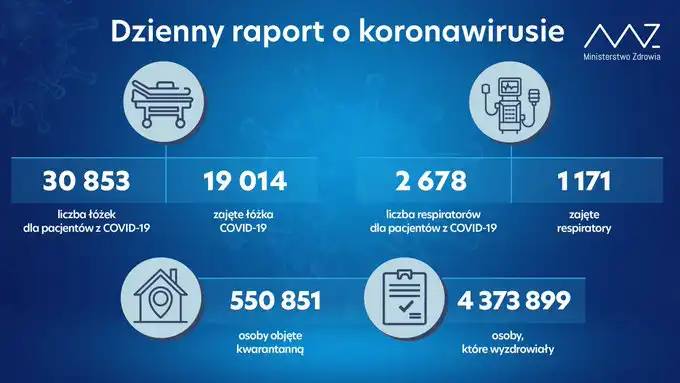 Od początku pandemii w Polsce odnotowano 5 224 144 zakażeń koronawirusem. Zmarło 106 894 osób. Wyzdrowiało 4 373 899.