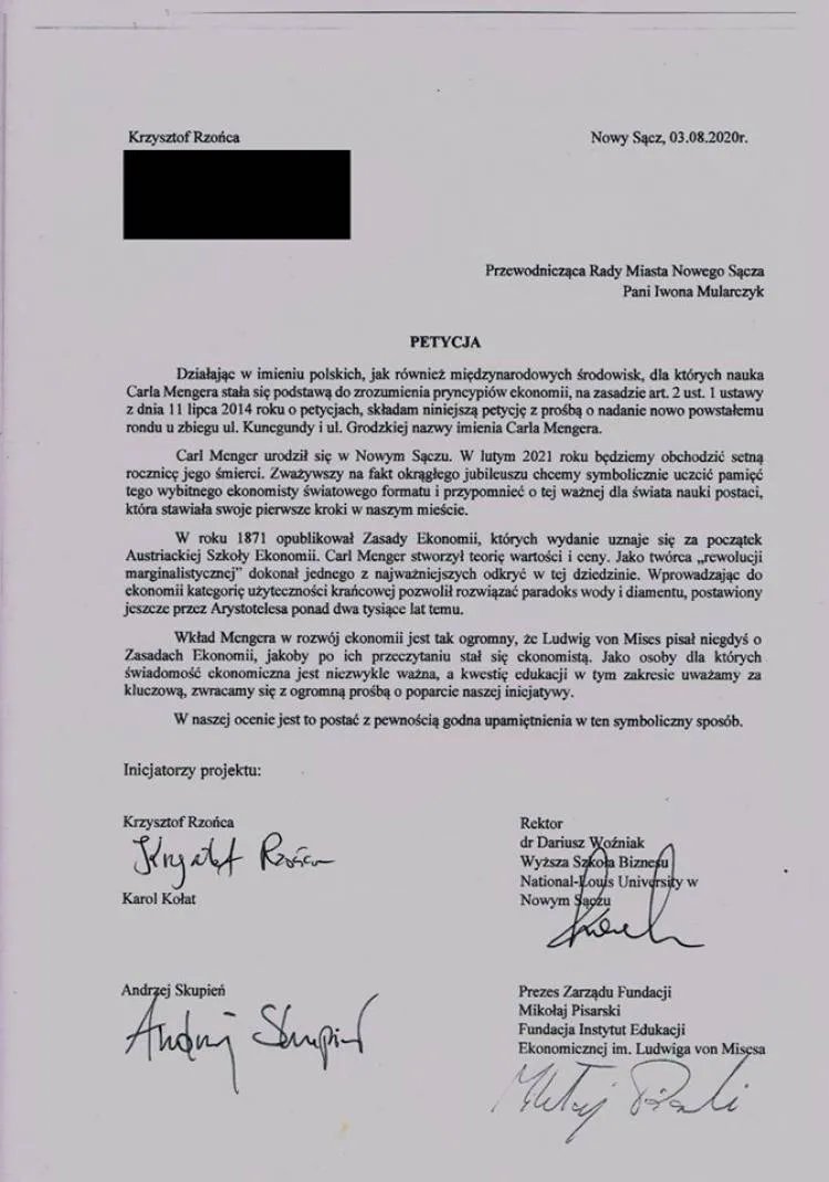 Już wcześniej, 3 sierpnia do Rady Miasta Nowego Sącza wpłynęła petycja o nadanie imienia Carla Mengera nowemu rondu u zbiegu ul. Kunegundy i ul. Grodzkiej w Nowym Sączu.
