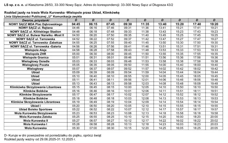 Poniżej rozkład jazdy obowiązujący od 29 czerwca 2025 r.: