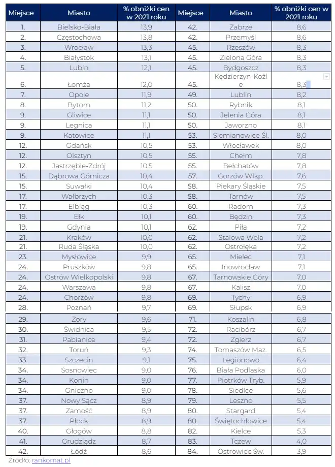 Nowy Sącz – ex aequo z Zamościem i Płockiem – znalazł się w rankingu na 37. miejscu. Wyżej uplasował się Kraków (21. miejsce, 10%), niżej z kolei Tarnów (58. miejsce, 7,5%). W skali całego kraju największą obniżkę odczuli mieszkańcy Bielska-Białej (13,9%), a najmniejszą Ostrowca Świętokrzyskiego (3,9%). Pełna lista poniżej: