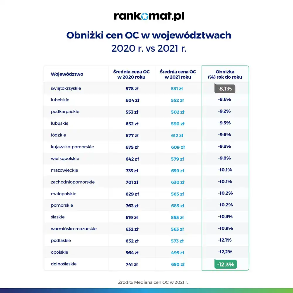 Średnia cena OC w Nowym Sączu była niższa o 35 zł od przeciętnej składki, którą musieli zapłacić kierowcy z województwa małopolskiego (565 zł). Jednocześnie obniżka, którą odczuli mieszkańcy tego regionu w 2021 roku, wyniosła 10,2% w porównaniu do roku 2020. Najmniej obowiązkowe ubezpieczenie potaniało w województwie świętokrzyskim. W skali całego kraju zmotoryzowani nowosądeczanie również mają powody do zadowolenia – płacą o 72 zł mniej od statystycznego kierowcy, ponieważ średnia cena OC w Polsce w 2021 roku wyniosła 602 zł.