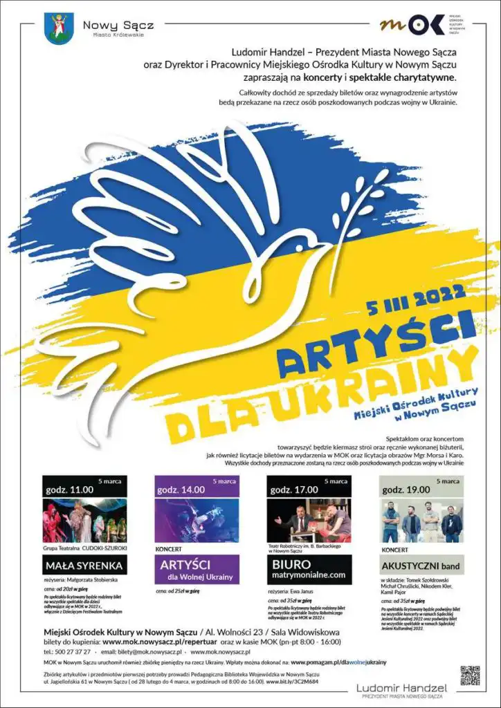 W najbliższą sobotę 5 marca od godz.11.00 do 21:30 w Miejskim Ośrodku Kultury w Nowym Sączu odbędzie się cykl wydarzeń kulturalnych, z których dochód zostanie w całości przeznaczony na pomoc dla Ukrainy.