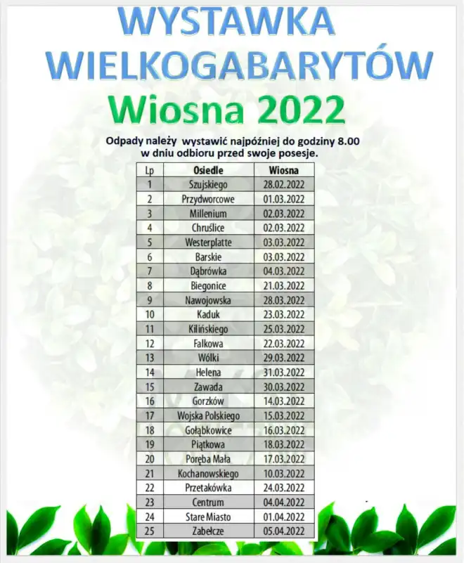 Mieszkańcy miasta będą mogli pozbyć się za darmo przedmiotów, które zalegają w ich domostwach i nie mieszczą się w standardowych pojemnikach na odpady. Duże gabaryty oraz zużyty sprzęt należy wystawić w wyznaczonych dniach, do godz. 8 przed swoje posesje.