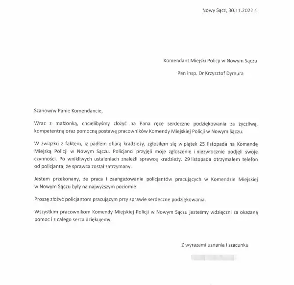Działania sądeckich policjantów, które zaowocowały szybkim ustaleniem i zatrzymaniem sprawcy, zyskały uznanie pokrzywdzonego i jego małżonki. Sądeczanie w piśmie przesłanym do Komendanta Miejskiego Policji w Nowym Sączu, insp. dra Krzysztofa Dymury, zwrócili się do niego m.in. takimi słowami: „Chcielibyśmy złożyć na Pana ręce serdeczne podziękowania za życzliwą, kompetentną oraz pomocną postawę pracowników Komendy Miejskiej Policji w Nowym Sączu. […] Jestem przekonany, że praca i zaangażowanie policjantów były na najwyższym poziomie. Proszę złożyć policjantom pracującym przy sprawie serdeczne podziękowania. […] Jesteśmy wdzięczni za okazaną pomoc i z całego serca dziękujemy”.