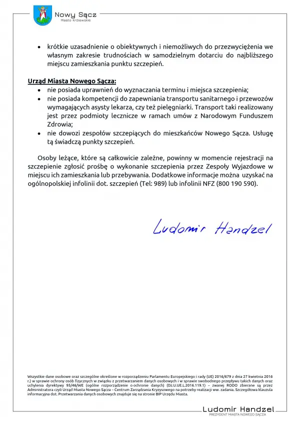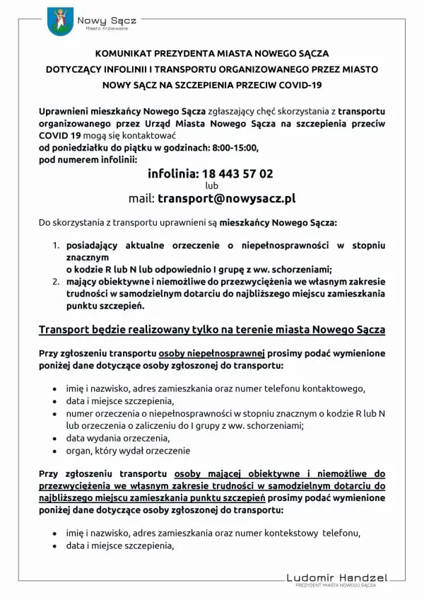Jak informuje sądecki magistrat uprawnieni mieszkańcy miasta Nowego Sącza mogą skorzystać z bezpłatnego transportu na szczepienie przeciw Covid -19.