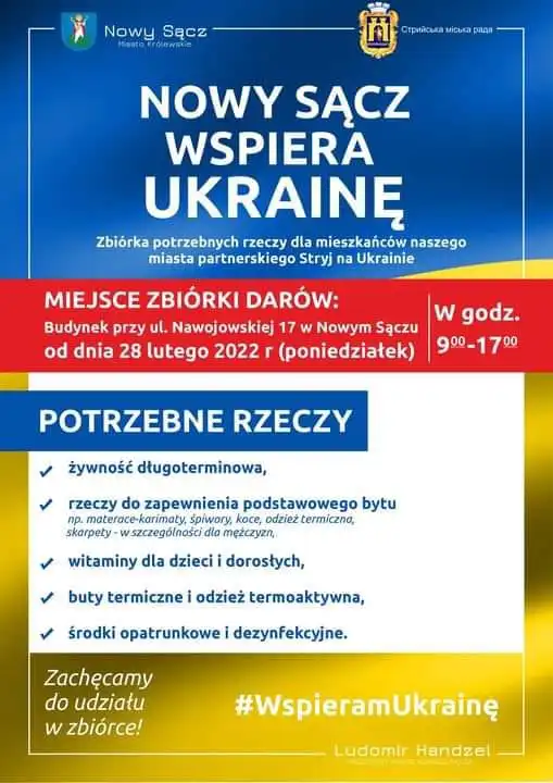 Zbiórka potrzebnych rzeczy dla mieszkańców miasta partnerskiego Stryj na Ukrainie będzie prowadzona cały tydzień od 9.00 do 17.00 począwszy od poniedziałku 28.02.2022 r. w budynku przy ul. Nawojowskiej 17 w Nowym Sączu.