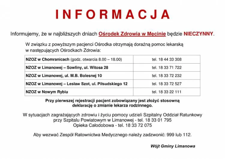 Wójt Gminy Limanowa informuje, że w najbliższych dniach Ośrodek Zdrowia w Męcinie będzie nieczynny. W związku z zaistniałym faktem, pacjenci Ośrodka mają zapewnioną pomoc lekarską w Ośrodkach Zdrowia w Limanowej, Chomranicach i Nowym Rybiu.