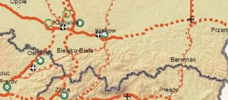 Poniżej umieszczony jest fragment mapy z aktualnej dyrektywy UE obejmujący Polskę i kraje przyległe, zbliżenie na obszar przygraniczny, z Dziennika Urzędowego Unii Europejskiej, gdzie uwidoczniona jest sieć bazowa i kompleksowa. W Małopolsce nie ma drogi włączonej do korytarza sieci bazowej, są tylko ciągi S7 i DK7 oraz DK52, umieszczone w korytarzu sieci kompleksowej. Najbliższa Małopolski droga sieci bazowej to S1 w województwie śląskim.