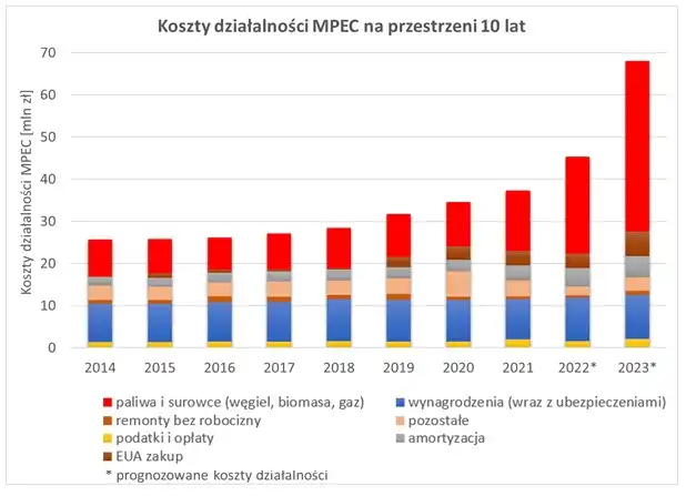 Główną i najistotniejszą przyczyną wzrostów cen produkcji oraz przesyłu ciepła jest bardzo istotny, niespotykany dotychczas wzrost cen paliw i surowców, co zostało przedstawione na wykresie Koszty działalności MPEC na przestrzeni 10 lat. Ponadto, równie ważnym elementem jest wzrost kosztów uprawnień do emisji CO2.