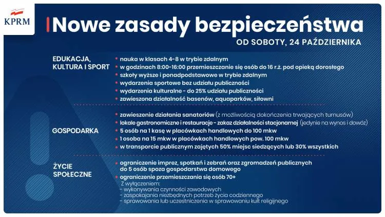 Od soboty, 24 października cała Polska zostanie objęta obostrzeniami czerwonej strefy. Wśród zmian znajdą się: zajęcia zdalne również w klasach 4-8 szkół podstawowych, obowiązek przemieszczania się osób poniżej 16. roku życia pod opieką rodzica lub opiekuna, a także ograniczenia w funkcjonowaniu lokali gastronomicznych, sanatoriów oraz organizacji imprez, spotkań i zgromadzeń. Rząd uruchamia też Solidarnościowy Korpus Wsparcia Seniorów – program przeznaczony do koordynacji pomocy osobom starszym, zarówno na szczeblu centralnym, jak i samorządowym.