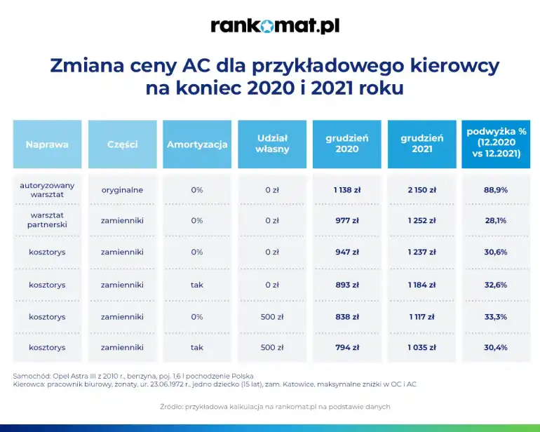 Ceny pakietów OC AC przedstawione powyżej są uśrednione i odnoszą się do ofert kilkunastu towarzystw w każdym wariancie ochrony autocasco. Na ich podstawie nie można więc stwierdzić, czy i jakie podwyżki dotyczyły poszczególnych metod likwidacji szkody z polisy AC. Eksperci rankomat.pl sprawdzili więc ceny różnych wariantów ochrony autocasco, proponowanych przykładowemu kierowcy w grudniu 2020 r. i 2021 r.